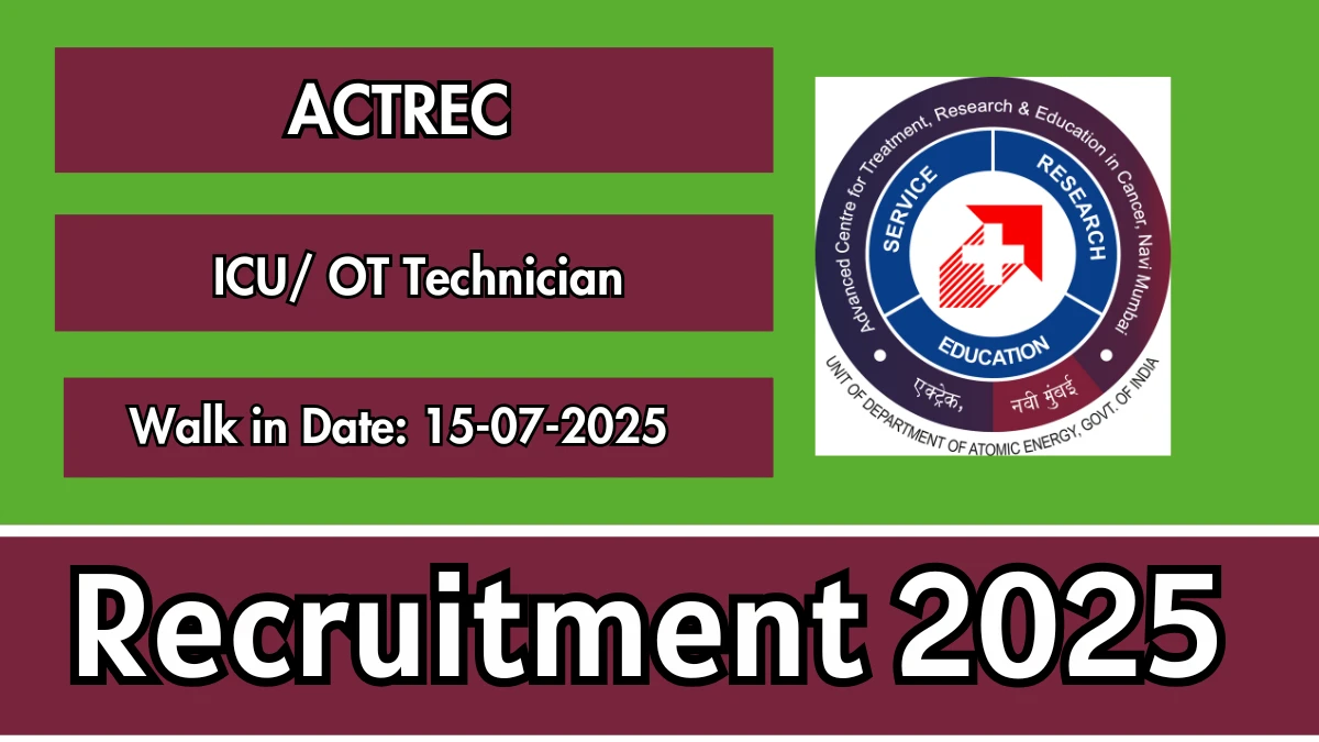 Advanced Centre for Treatment, Research and Education in Cancer (ACTREC) is conducting a walk-in interview for ICU/OT Technician positions. Candidates with a B.Sc degree are eligible. Walk-in interview date is July 31, 2025. Total vacancies: Not Mentioned.