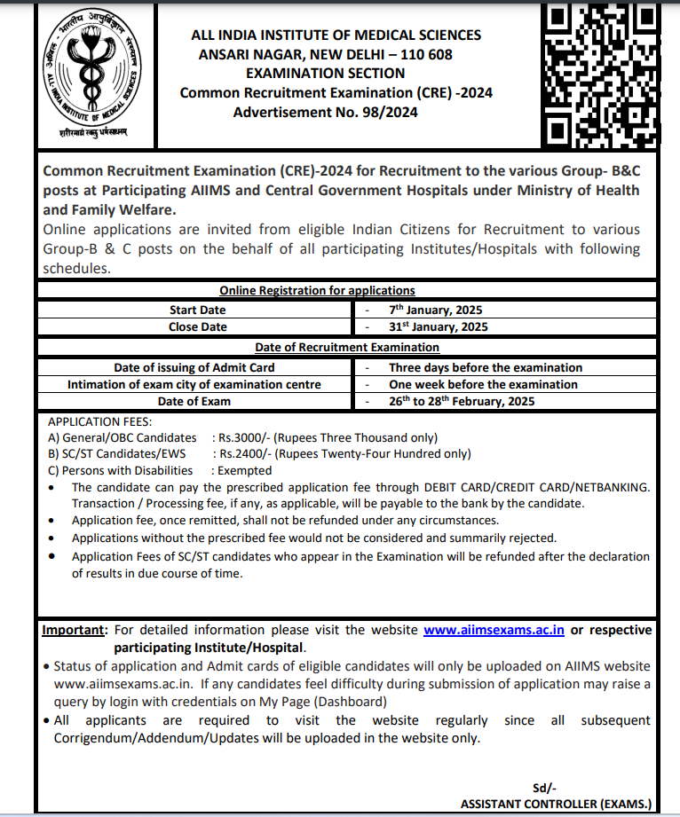 All India Institute of Medical Sciences (AIIMS), New Delhi, has announced the recruitment for various posts under the CRE (Common Recruitment Examination) for 2025.
