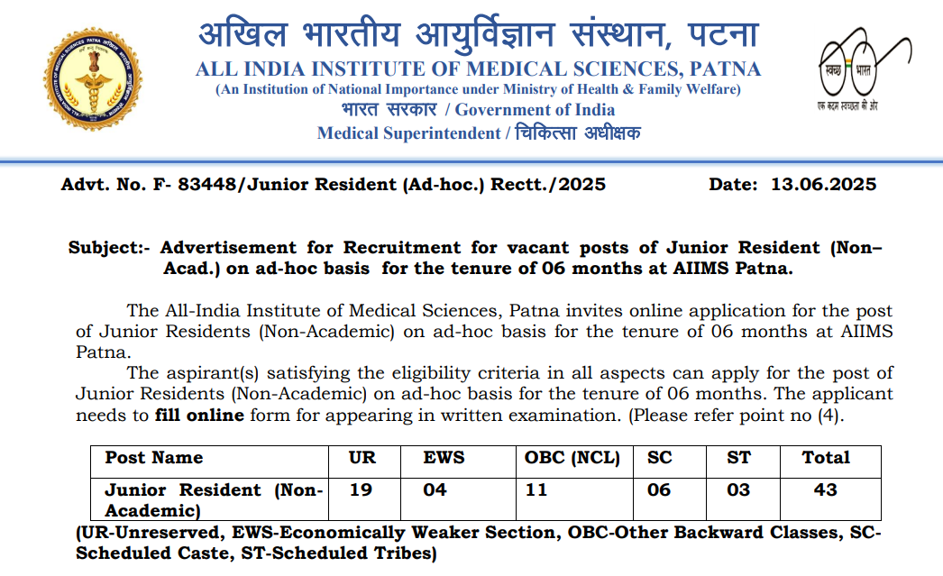 AIIMS Patna is recruiting for the position of Junior Resident. A total of 43 posts are available. The online application process starts on 16-06-2025 and closes on 09-07-2025. Apply through the official AIIMS Patna website.
