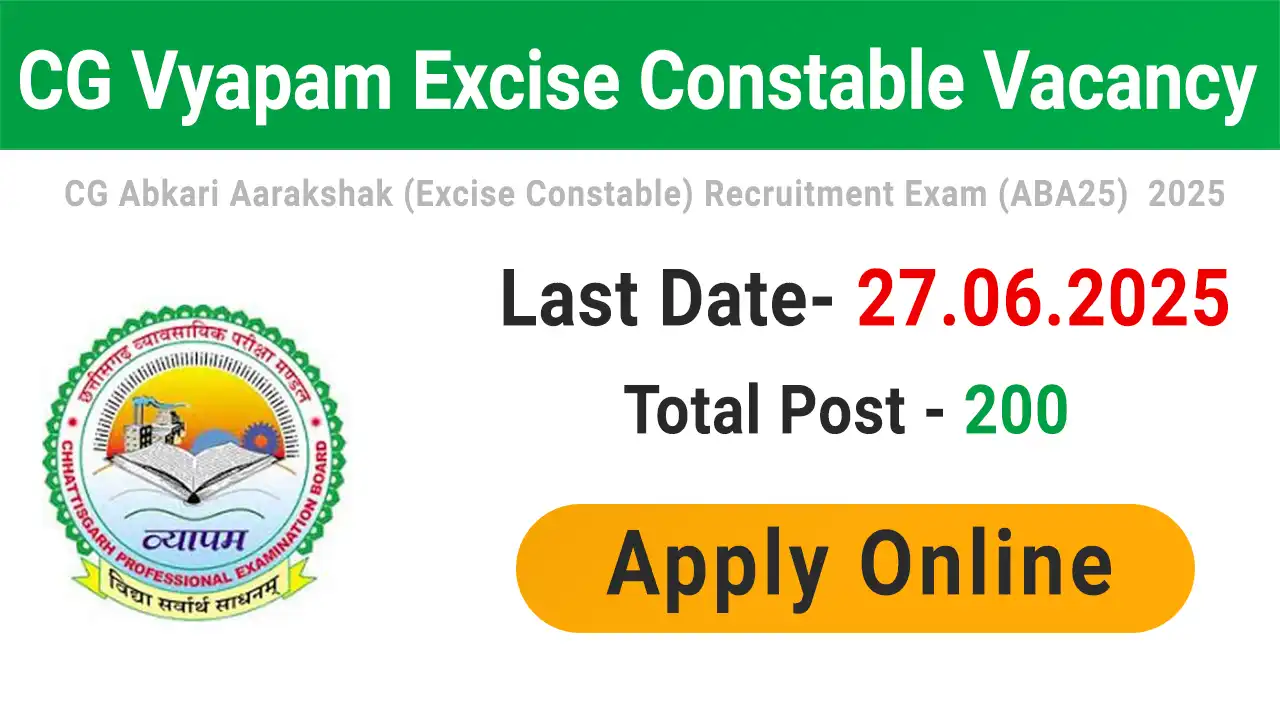 Chhattisgarh Professional Examination Board (CG Vyapam) has announced the recruitment for Excise Constables. Total posts: 200. Apply online from June 4, 2025 to June 27, 2025. 📋