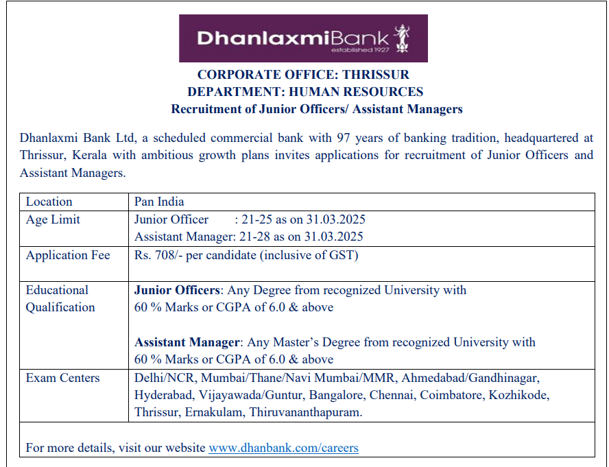 Dhanlaxmi Bank Recruitment 2025 | Dhanlaxmi Bank Vacancy