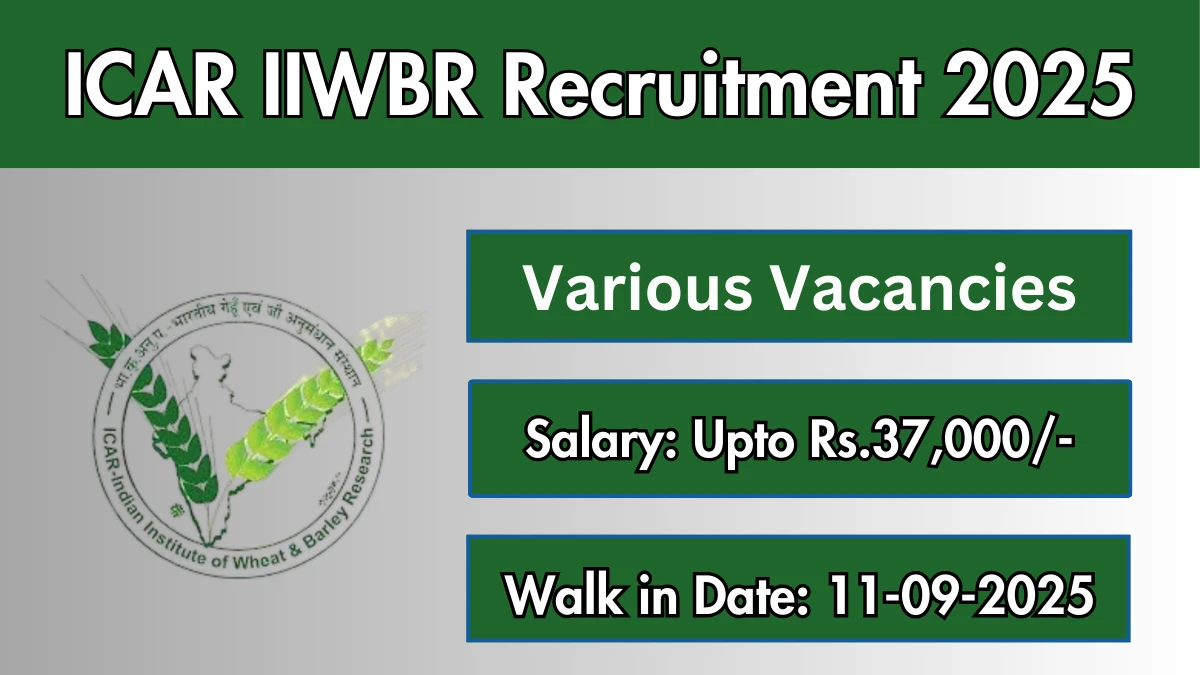 ICAR Indian Institute of Wheat and Barley Research (IIWBR) is conducting a walk-in interview for SRF, Field Work, and other positions. Total posts available: 2. Walk-in dates: 08-09-2025 to 11-09-2025. Read the complete notification for detailed information. 📋