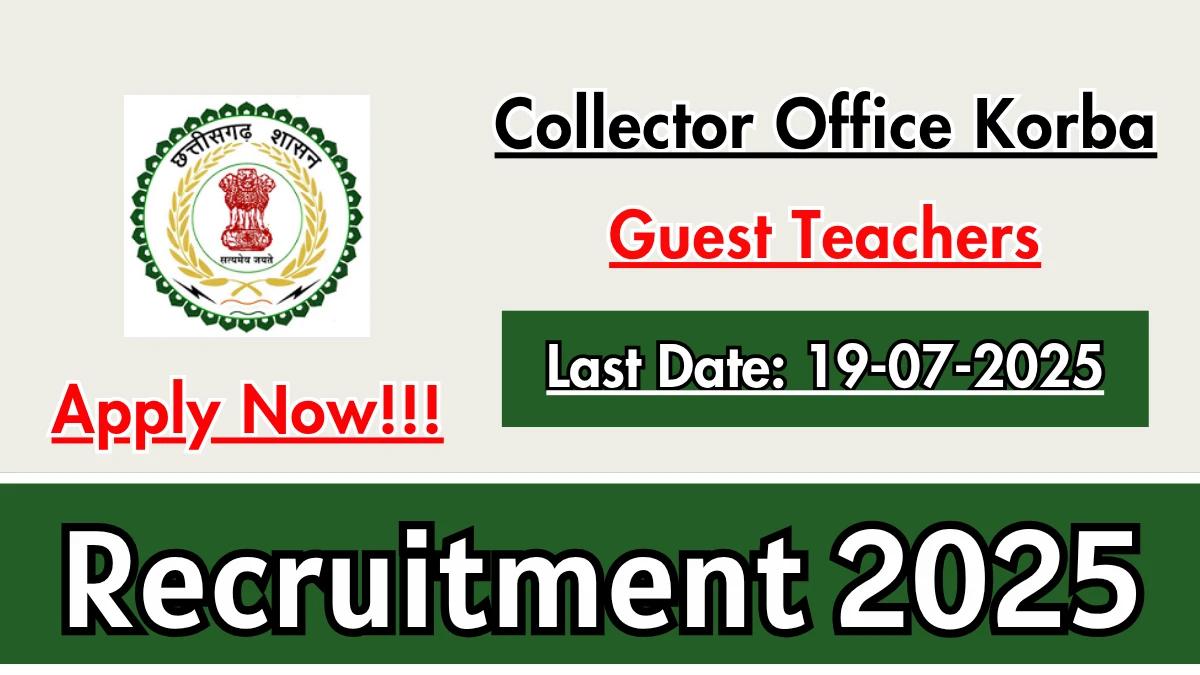 Collector Office Korba is inviting applications for Guest Teachers. Apply online from July 14, 2025 to July 19, 2025. Total number of posts: Not Specified. 📋