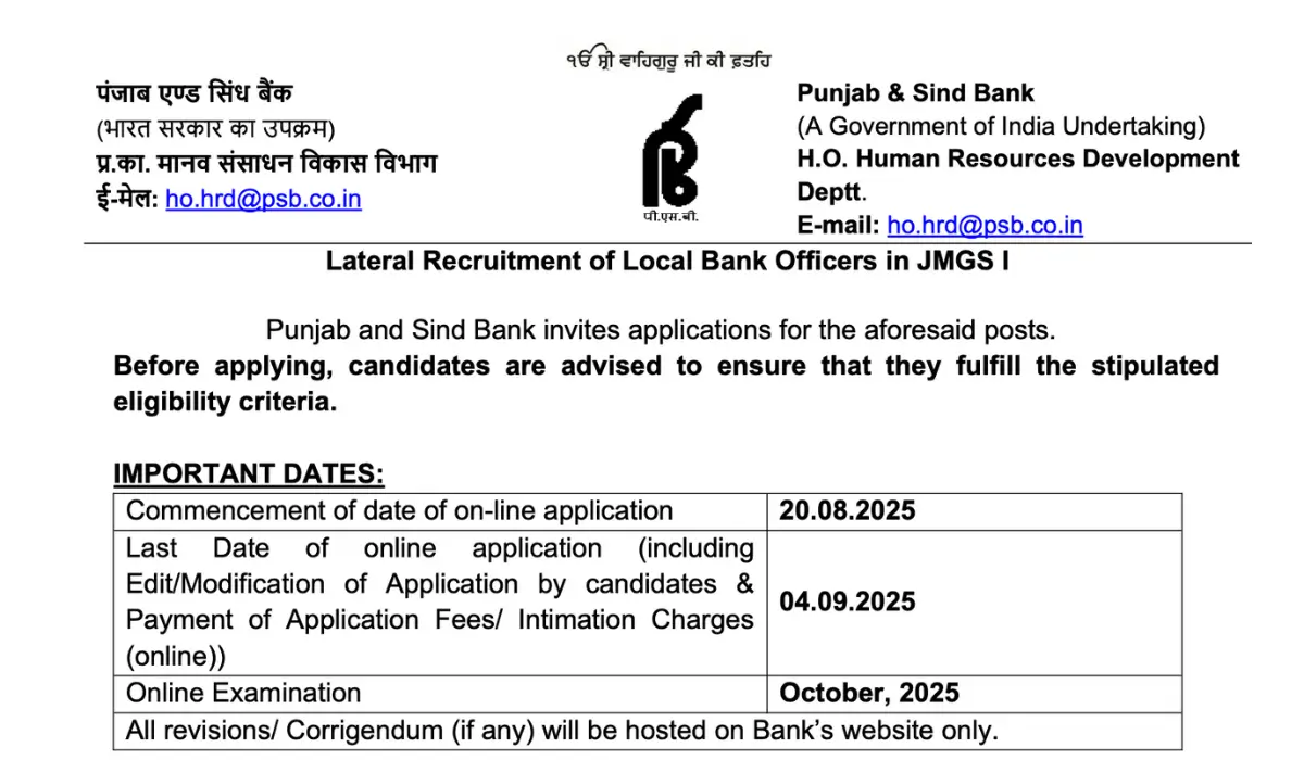 Punjab and Sind Bank is recruiting for 750 Local Bank Officer positions. Graduates are eligible to apply online. The application window is open from August 20, 2025, to September 4, 2025. 📋
