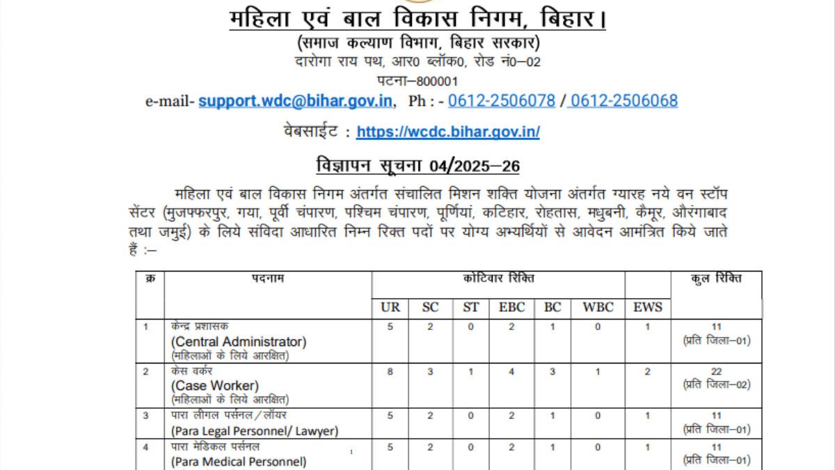 Women and Child Development Corporation (WCDC) Bihar has announced recruitment for various posts. A total of 77 vacancies are available. The online application process starts on June 26, 2025, and the last date to apply is July 18, 2025.